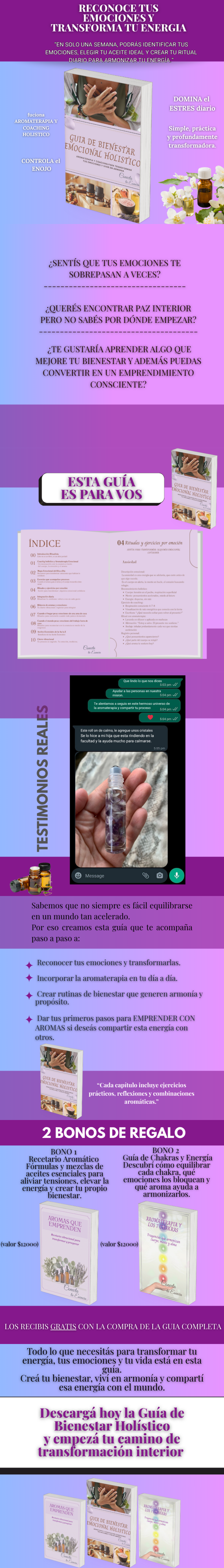 “Una guía que transforma desde el alma.” Me sentí acompañada en cada página. Las recetas aromáticas me inspiraron a crear mis propios blends y el bono para emprender me dio claridad para lanzar mi primer servicio holístico. ¡Gracias por tanta luz!